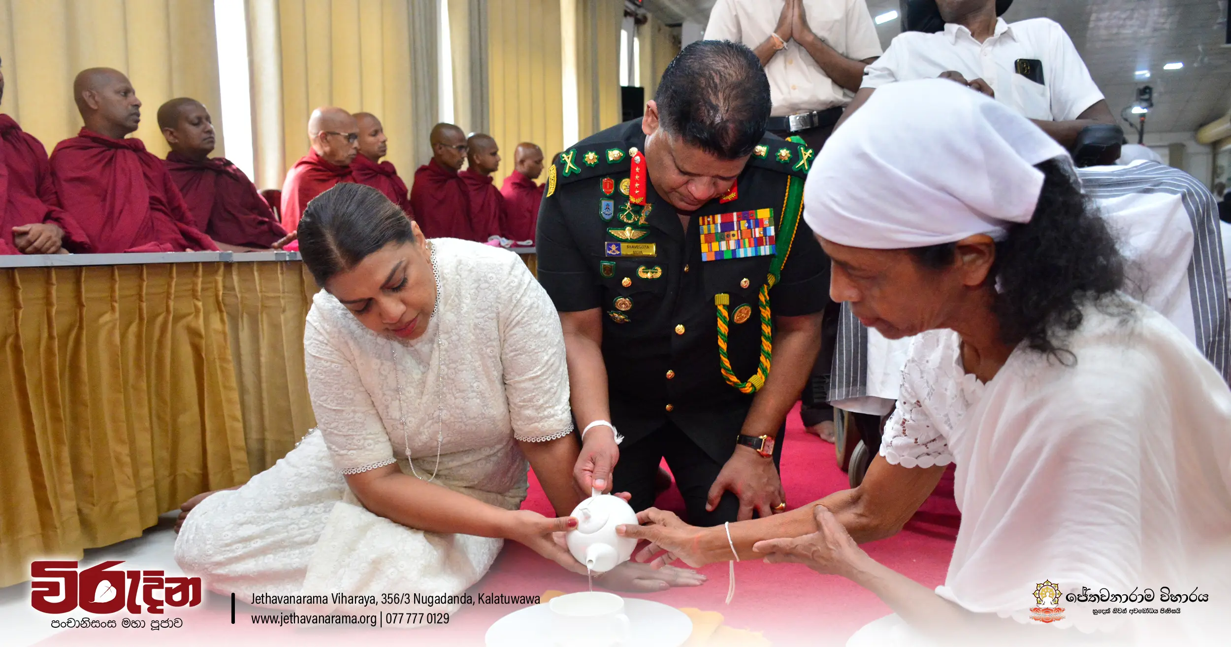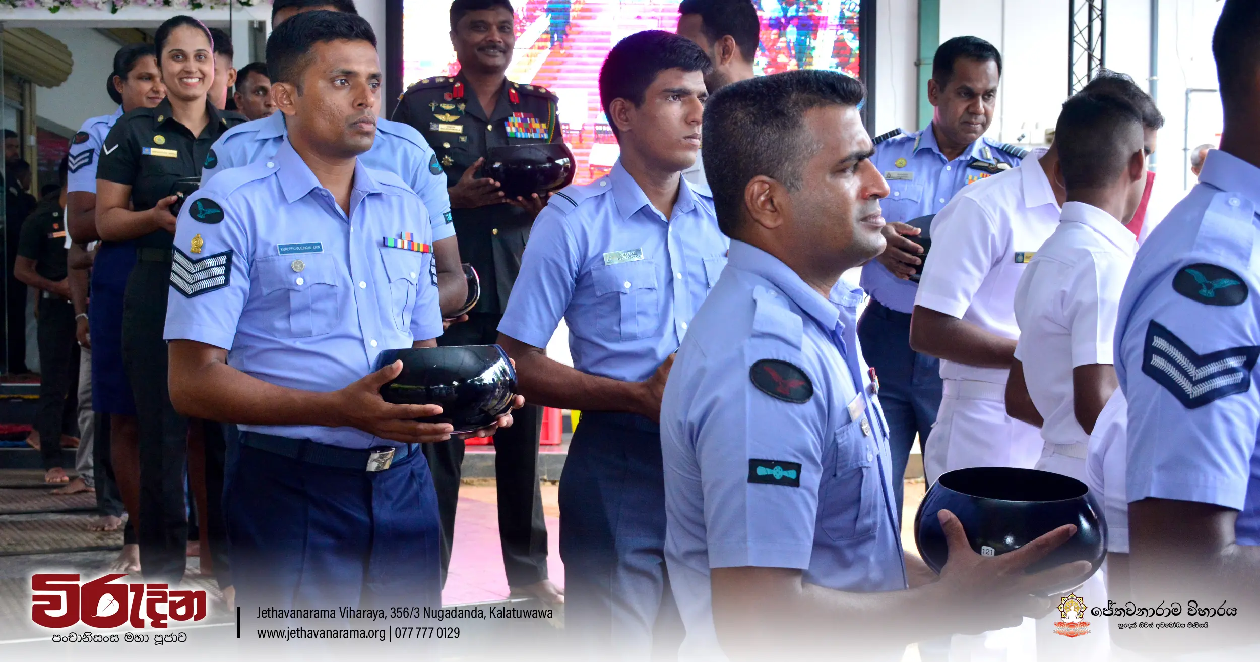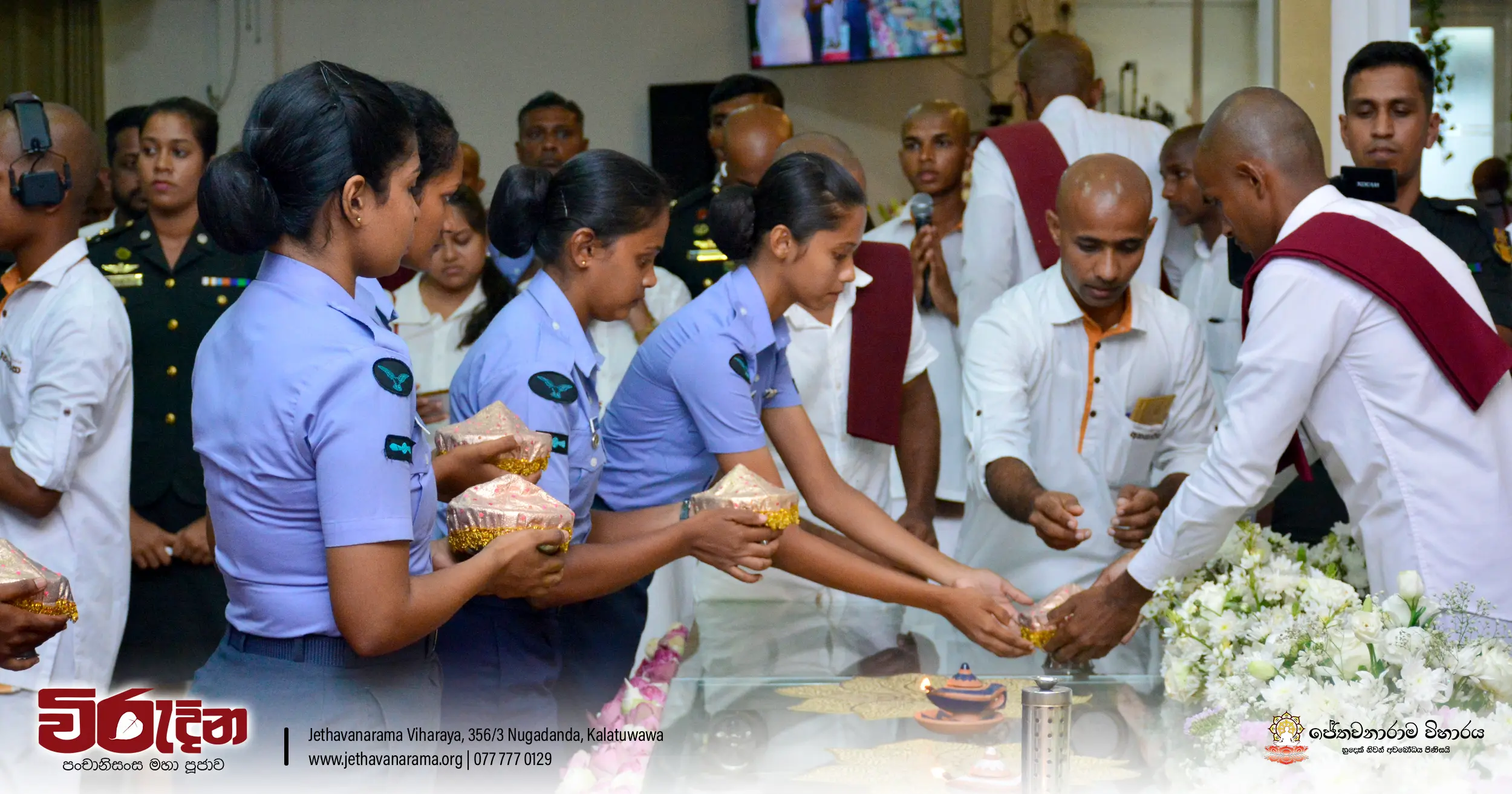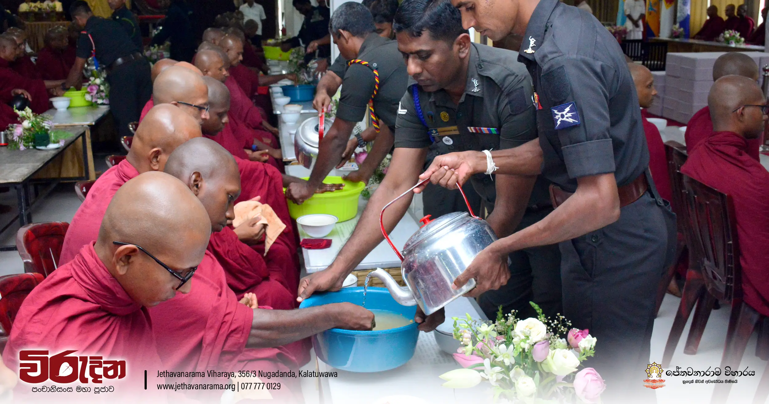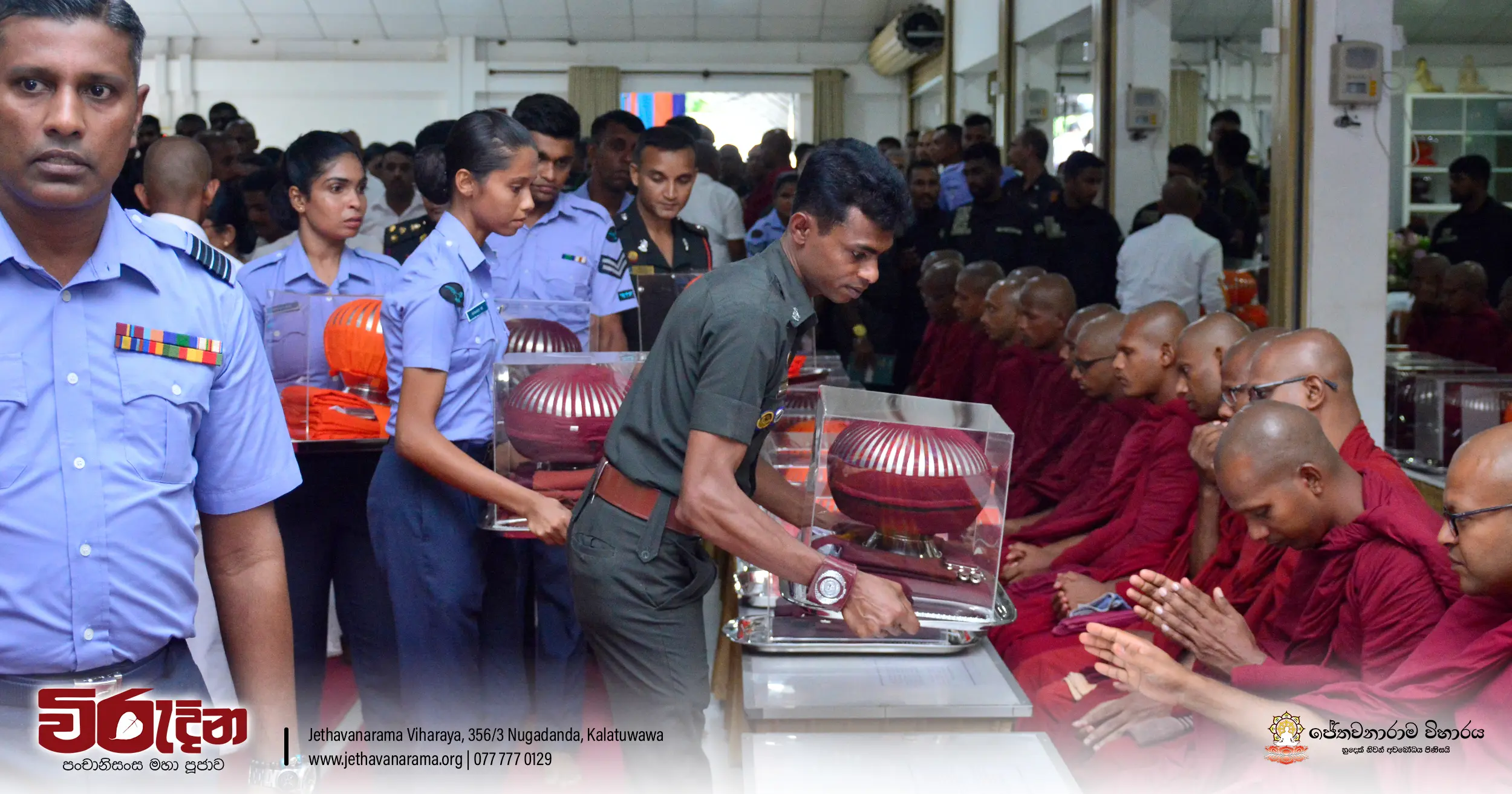 On the occasion of the 15th Victory Day, members of the Tri-forces and police personnel offered arms to 135 revered monks.They honored the memory of those who lost their lives during the war conflict and transferred merits.