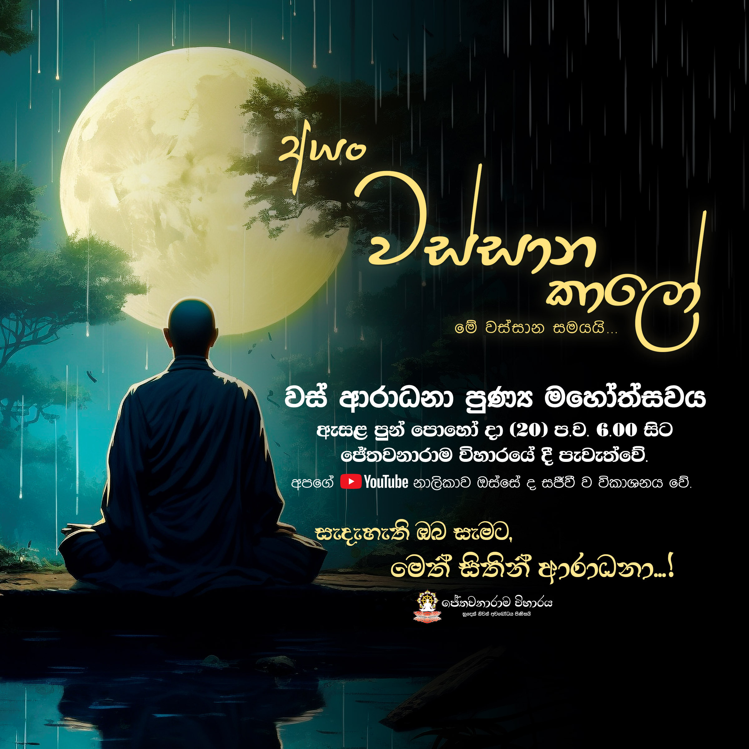 අයං වස්සාන කාලෝ වස් ආරාධනා පුණ්ය මහෝත්සවය ඇසළ පොහෝ දා (20) ප.ව. 6:00 සිට පැවැත්වේ.